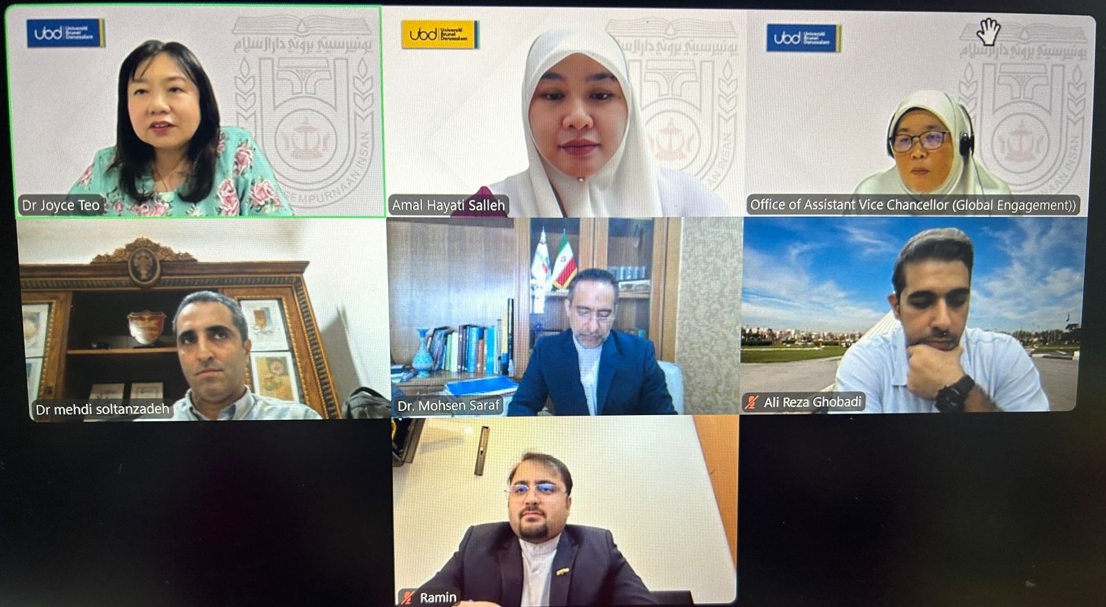 در این وبینار، از طرف کشورمان آقای دکتر محسن صراف، رایزن علمی جمهوری اسلامی ایران در منطقه جنوب شرق آسیا، آقای دکتر علی مهام و آقای دکتر مهدی سلطانزاده به همراه آقای رامین فروغی، معاون نمایندگی جمهوری اسلامی ایران در برونئی دارالسلام حضور بهم رساندند و از طرف برونئی خانم دکتر جویس تئو، معاون رئیس دانشگاه UBD و خانم ارماتی احمد از بخش بینالملل این دانشگاه و خانم امل حیاتی دستیار خانم تئو حضور بهم رساندند.