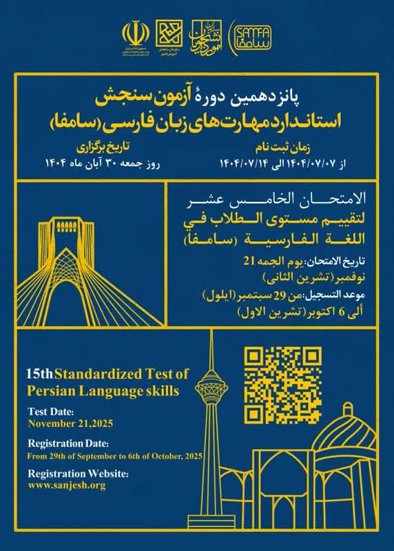 در خصوص پانزدهمین دوره آزمون سنجش استاندارد مهارتهای زبان فارسی (سامفا)، آدرس اینترنتی ذیل جهت ثبت نام در این آزمون اعلام می‌گردد.