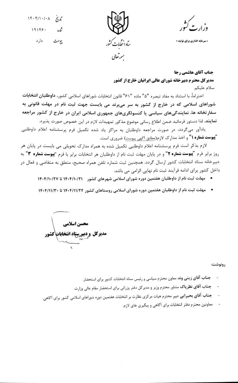 بدین‌وسیله به آگاهی هم‌وطنان ارجمند مقیم برونئی دارالسلام می‌رساند؛ آن دسته از داوطلبان انتخابات شورای اسلامی‌ شهر که مقیم برونئی هستند، می‌بایست جهت ثبت نام در مهلت قانونی به سفارت کشورمان در بندر سری بگاوان مراجعه نمایند.
